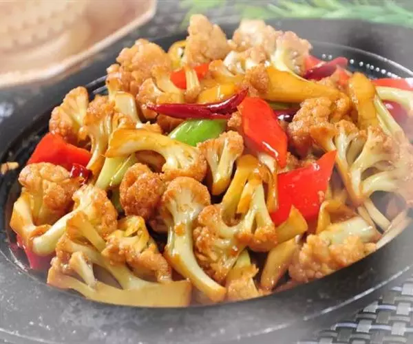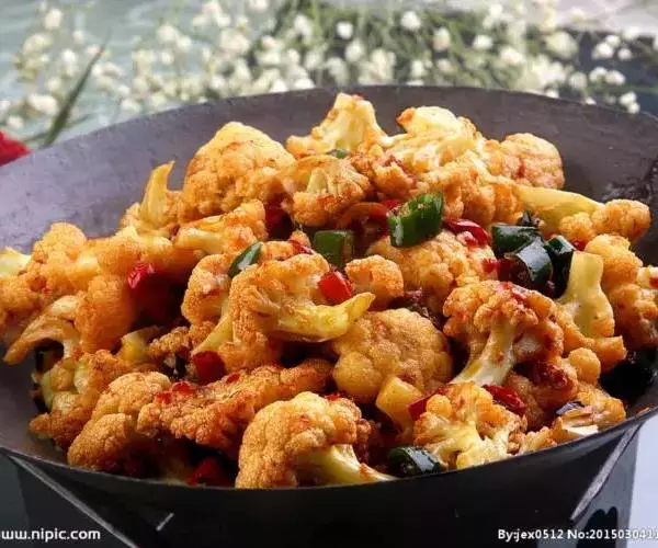 3、炒制花菜时一定要小火煸炒,不用加水,等炒出花菜香味时再加调味料会更入味;