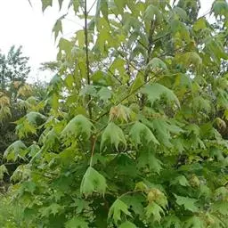 岷山色木槭(变种)(植物分类学报)该变种与原种和前变种的区别在于该变种的叶近于革质,基部近于圆形或近于心脏形,显著地3裂,裂片三角形,先端锐尖;翅果长约2.61-3厘米,小坚果压扁状,近于卵形,长8-10毫米,宽6-8毫米,翅长圆倒卵形或近于镰刀形,长1.6-2厘米,宽1-1.2厘米;张开近于水平或稍反卷。花期不明,果期9月。产四川西部 (岷山与邛崃山两山脉)和云南西北部(雪山山脉)。生于海拔2300-2800米的疏林中。模式标本采自四川理县。