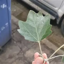 叶三角状卵圆形或近圆形,长宽近等,长3-6厘米,先端钝尖、急尖或短渐尖,基部圆形、截形或浅心形,边缘有密波状浅齿,发叶时显红色,萌枝叶大,三角状卵圆形,下面被柔毛;叶柄侧扁,长2-6厘米。