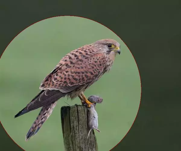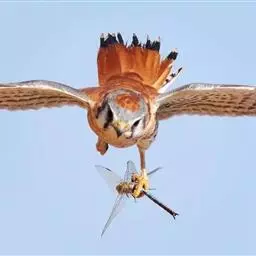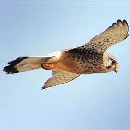 红隼(学名:Falco tinnunculus):是隼科的小型猛禽之一。体重173-335克,体长305-360毫米。翅狭长而尖,尾亦较长,外形和共同爪隼非常相似。雄鸟头蓝灰色,背和翅上覆羽砖红色,具三角形黑斑;腰、尾上覆羽和尾羽蓝灰色,尾具宽阔的黑色次端斑和白色端斑,眼下有一条垂直向下的黑色口角髭纹。下体颏、喉乳白色或棕白色,其余下体乳黄色或棕黄色,具黑褐色纵纹和斑点。雌鸟上体从头至尾棕红色,具黑褐色纵纹和横斑,下体乳黄色,除喉外均被黑褐色纵纹和斑点,具黑色眼下纵纹。脚、趾黄色,爪黑色。