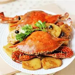 梭子蟹800克、花椒5克、蒜瓣3个、老姜3片、葱6克、生抽1汤匙、白糖、盐各1茶匙、料酒、海鲜酱各2茶匙
