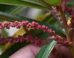 圆锥花序腋生,或植株上部的为雌性,其下的为雄性,或同一植株的全为雌性,长2-9厘米;雄团伞花序直径1-3毫米,有少数雄花;雌团伞花序直径0.5-2毫米,有多数密集的雌花。雄花:花被片4,狭椭圆形,长约1.5毫米,合生至中部,顶端急尖,外面有疏柔毛;雄蕊4,长约2毫米,花药长约0.6毫米;退化雌蕊狭倒卵球形,长约0.7毫米,顶端有短柱头。雌花:花被椭圆形,长0.6-1毫米,顶端有2-3小齿,外面有短柔毛,果期菱状倒披针形,长0.8-1.2毫米;柱头丝形,长0.5-0.6毫米。