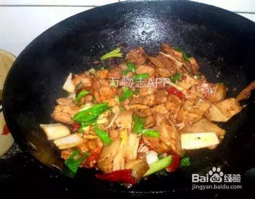 7.当素鸡片粘满油,倒入煎好的五花肉中,用锅中剩余的油炒郫县豆瓣酱至出红油,再倒入煎好的五花肉片、素鸡等,翻炒均匀,放入鸡精调味,即可出锅。