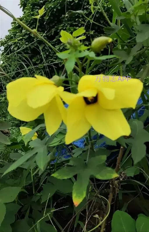 黄蜀葵,别名:秋葵、棉花葵、假阳桃、野芙蓉、黄芙蓉、黄花莲、鸡爪莲、疽疮药、追风药、豹子眼睛花、荞面花,拉丁文名:Abelmoschus manihot (Linn.) Medicus ,锦葵科、秋葵属一年生或多年生粗壮直立草本植物。茎被黄色刚毛。叶大,卵形至近圆形。花期6~8月。原产我国南方。常生于山谷草丛、田边或沟旁灌丛间。分布于印度。