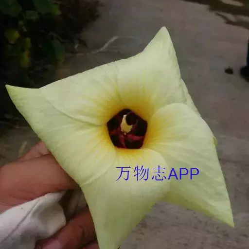 一年生或多年生草本,高1-2米,疏被长硬毛。叶掌状5-9深裂,直径15-30厘米 黄蜀葵 ,裂片长圆状披针形,长8-18厘米,宽1-6厘米,具粗钝锯齿,两面疏被长硬毛;叶柄长6-18厘米,疏被长硬毛;托叶披针形,长11-1.5厘米。花单生于枝端叶腋;小苞片4-5,卵状披针形,长15-25毫米,宽4-5毫米,疏被长硬毛;萼佛焰苞状,5裂,近全缘,较长于小苞片,被柔毛,果时脱落;花大,淡黄色,内面基部紫色,直径约12厘米;雄蕊柱长1.5-2厘米,花药近无柄;柱头紫黑色,匙状盘形。蒴果卵状椭圆形,长4-5厘米,直径2.5-3厘米,被硬毛;种子多数,肾形,被柔毛组成的条纹多条。花期8-10月。