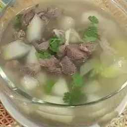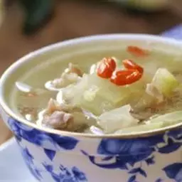 原料:冬瓜100克,瘦羊肉80克,枸杞3克,生姜10克,葱10克。