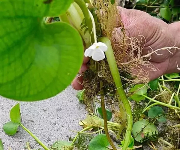 浮水草本。须根长可达30厘米。匍匐茎发达,节间长3-15厘米,直径约4毫米,顶端生芽,并可产生越冬芽。叶簇生,多漂浮,有时伸出水面;叶片心形或圆形,长4.5-5厘米,宽5-5.5厘米,先端圆,基部心形,全缘,远轴面有蜂窝状贮气组织,并具气孔;叶脉5条,稀7条,中脉明显,与第一对侧生主脉所成夹角呈锐角。雄花序腋生;花序梗长0.5-3.5厘米;佛焰苞2枚,膜质,透明,具红紫色条纹,苞内雄花5-6朵,每次仅1朵开放;花梗长5-6.5厘米;萼片3,离生,长椭圆形,长约6毫米,宽约3毫米,常具红色斑点,尤以先端为多,顶端急尖;花瓣3,黄色,与萼片互生,广倒卵形或圆形,长约1.3厘米,宽约1.7厘米,先端微凹,基部渐狭,近轴面有乳头状凸起;雄蕊12枚,成4轮排列,最内轮3枚退化,最外轮3枚与花瓣生互,基部与第3轮雄蕊联合,第2轮雄蕊与最内轮退化雄蕊基部联合,最外轮与第2轮雄蕊长约3毫米,花药长约1.5毫米,第3轮雄蕊长约3.5毫米,花药较小,花丝近轴面具乳突,退化雄蕊顶端具乳突,基部有毛;花粉圆球形,表面具凸起纹饰;雌佛焰苞小,苞内雌花1朵;花梗长4-8.5厘米;花大,直径约3厘米;萼片3,先端圆,长约11毫米,宽约4毫米,常具红色斑点;花瓣3,白色,基部黄色,广倒卵形至圆形,较雄花花瓣大,长约1.5厘米,宽约1.8厘米,近轴面具乳头状凸起;退化雄蕊6枚,成对并列,与萼片对生;腺体3枚,黄色,肾形,与萼片互生;花柱6,每枚2深裂,长约4毫米,密被腺毛;子房下位,不完全6室。果实浆果状,球形至倒卵形,长0.8-1厘米,直径约7毫米,具数条沟纹。种子多数,椭圆形,顶端渐尖;种皮上有许多毛状凸起。花果期8-10月。