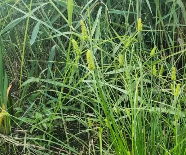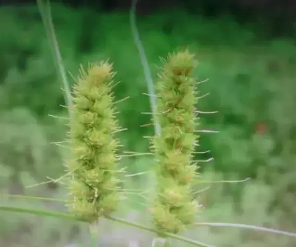 苞片下部的叶状,显著长于花序,无鞘,上部的刚毛状。小穗多数,雄雌顺序,卵形,长5-8毫米;穗状花序紧密,呈尖塔状圆柱形,长2.5-8厘米,宽1-1.8厘米。雄花鳞片长圆形,长2.8-3毫米,锈黄色,密生锈色点线;雌花鳞片卵形至长圆状椭圆形,顶端急尖,具芒尖,基部近圆形,长2-4毫米,宽约1.5毫米,锈黄色,密生锈色点线。