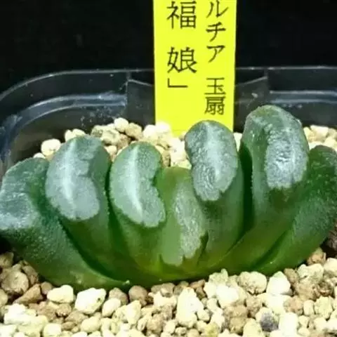 为玉露的锦斑品种。多年生肉质草本植物。株高4~5厘米,株幅6~8厘米。顶端角锥状的肉 质叶,呈半透明状,碧绿色间杂镶嵌乳白色斑纹, 顶端有细小的“须”。夏秋开花 ,花序高35厘米,白花。