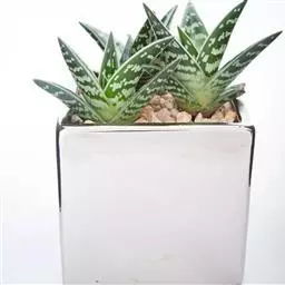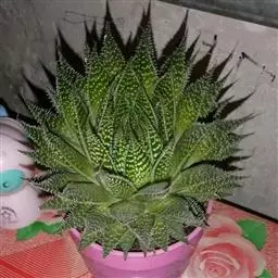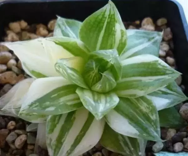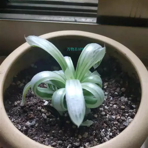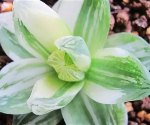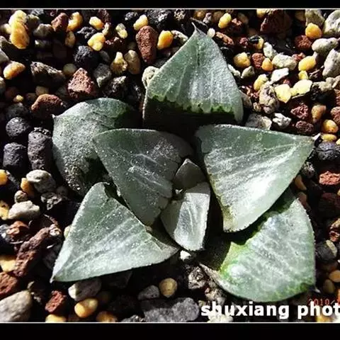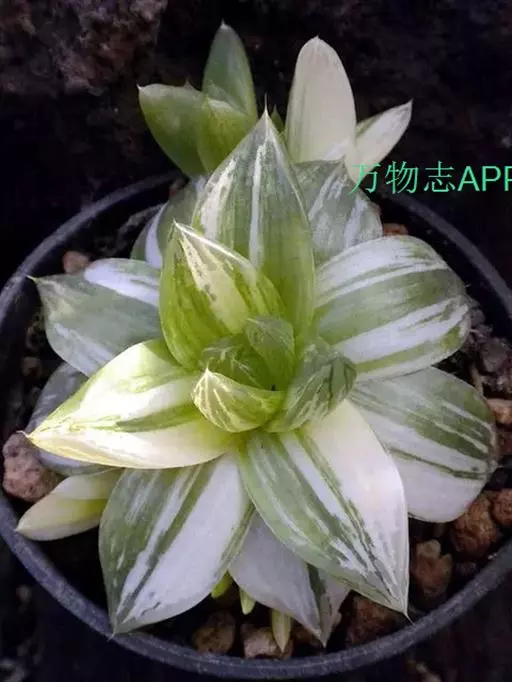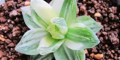 多年生肉质草本植物。株高4~5厘米,株幅6~8厘米。顶端角锥状的肉质叶,呈半透明状,碧绿色间杂镶嵌乳白色斑纹,顶端有细小的须。花序高35厘米,白花。
