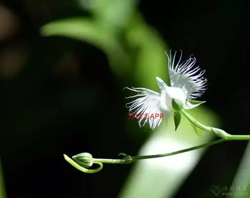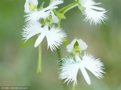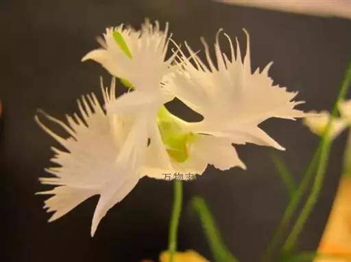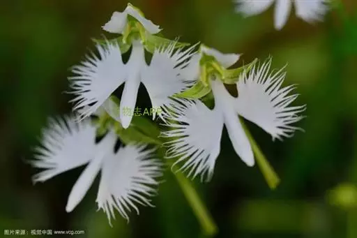 花瓣白色,斜卵形,直立,长10-12毫米,先端近急尖,外侧边缘具齿或浅的流苏,与中萼片靠合呈兜状;唇瓣白色,短楔形,长约巧毫米,3深裂;侧裂片较中裂片宽大,斜扇形,外侧边缘具长流苏状裂条,中裂片线形,长约1厘米,宽约2毫米,全缘,先端稍钝,具3脉;基部距狭圆筒状,长3-4厘米,下垂,向末端稍渐增粗。花期7-8月。