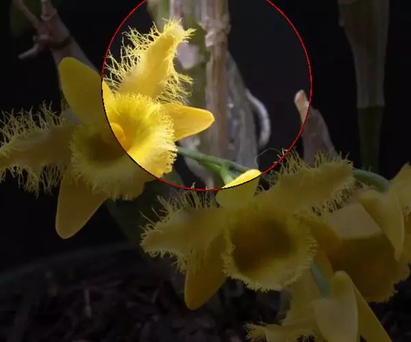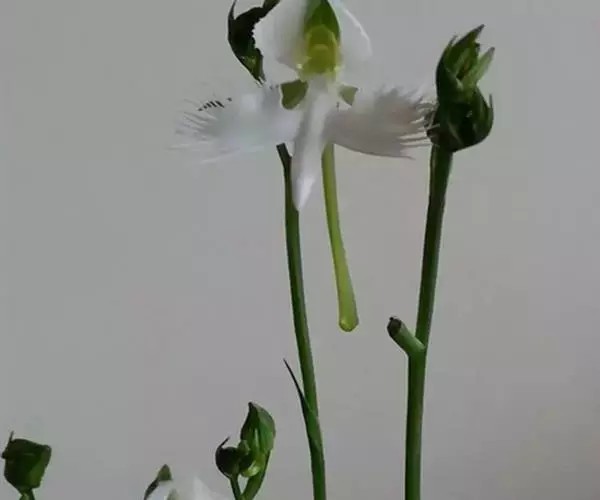 总状花序具1-2朵花;花苞片披针形,长7-12毫米,较子房短,先端渐尖;子房细圆柱形,扭转,无毛,连花梗长1.3-1.5厘米;花较小,直径约1.5-3厘米,白色;萼片淡绿色,狭卵形,长8-10毫米,先端钝,具5-7脉,中萼片近直立,侧萼片张开,偏斜。