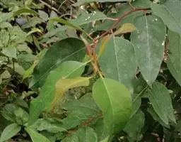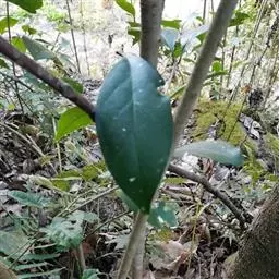 大乔木,高25米;树皮平滑,暗灰色,片状脱落,树干基部有宿存树皮;嫩枝圆形,最嫩部分略有棱。幼态叶对生,叶片阔披针形,长6-9厘米,宽2.5-4厘米;成熟叶片薄革质,狭披针形至披针形,长6-30厘米,宽1-2厘米,稍弯曲,两面有黑腺点,侧脉以45度角斜向上,边脉离叶缘0.7毫米;叶柄长1.5-2.5厘米,纤细。