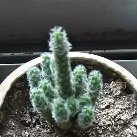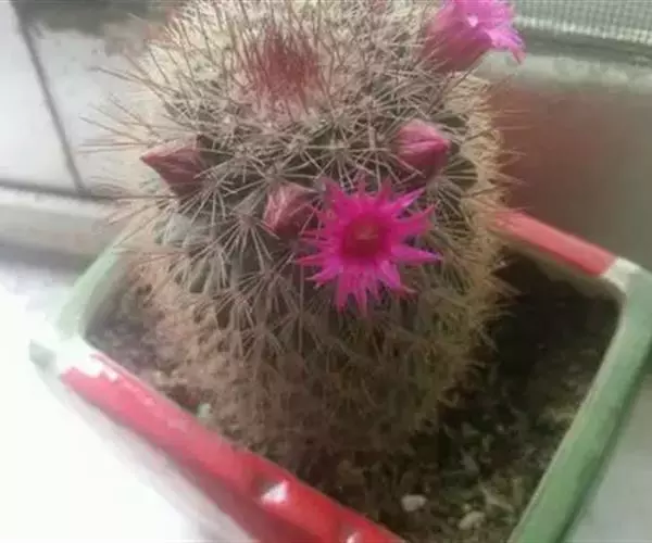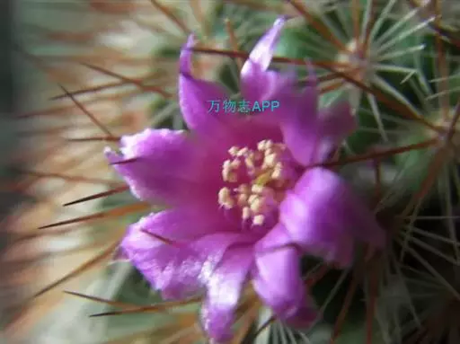 仙人掌科乳突球属,植株单生,圆筒状,高30cm,直径1Ocm。茎无白色乳汁 猩猩球 。疣突腋部有绵毛及刺毛。辐射刺20~30,常为白色,也有黄、褐或红色者;中刺7~15,针形,其中1根有钩。花浅红至紫红,直径1.5cm。