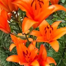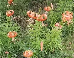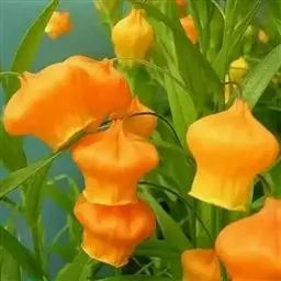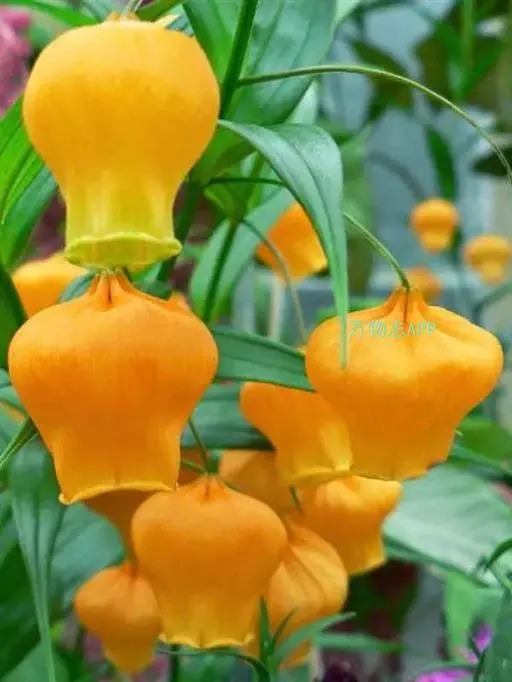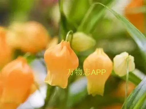 宫灯百合(学名:Sandersonia aurantiaca Hook.):仅一属一种。为多年生球根草本,由于其花形花色酷似中国宫灯而得名,多年生球根草本,半蔓性,高约1米。叶轮状互生,无柄,叶面光滑,柳叶形,长约5~10厘米,宽约2~3厘米,有3条深刻纹。 花坛状,形似宫灯,亮橙黄色,上阔下窄,宽处约2厘米,花柄约5厘米,下垂,腋生,有短裂片6,雄蕊6,花药丁字形,花柱三裂。7月~翌年1月,从仲夏到秋冬。瓶插寿命可达2~3周。蒴果3瓣,胞背开裂。
