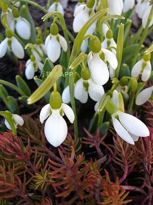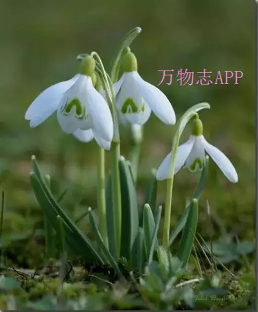 雪滴花 多年生草本,株高10~30cm。鳞茎小,径1.8~2.5cm,球形。叶丛生,线状带形,绿色被白粉,长15~23厘米,宽1.3厘米。