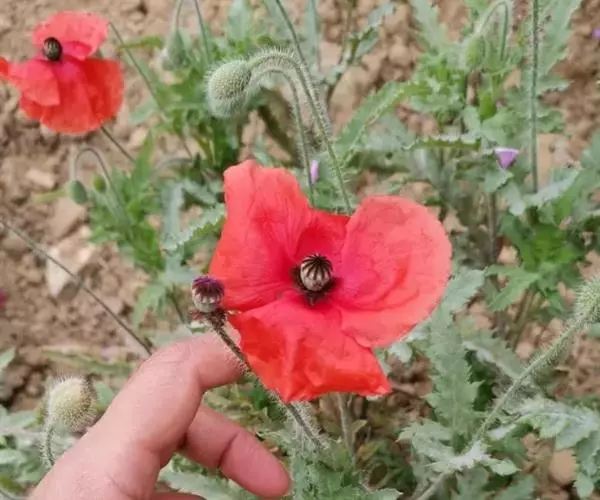 花单生于花葶顶端,4瓣或重瓣,纸质而有光彩,大红色或血红色,非常娇艳。花期4-5月。喜欢生活在麦田里,广泛的播撒它们细小的种子,休眠在泥土里的种子在土地翻耕后生长最好。主要特征为花心是黑色。
