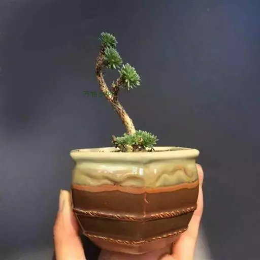植株低矮,多分枝,株型近似球状,老茎灰白色,新枝浅绿色,以后逐渐转为灰褐色,肉质叶近似针状,但稍宽,长约1cm,簇生于枝头,绿色,老叶干枯后贴在枝干上,形成类似松树皮般的龟裂,很久才脱落,露出光滑的肉质茎。小花黄色,星状。