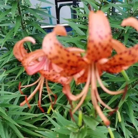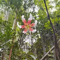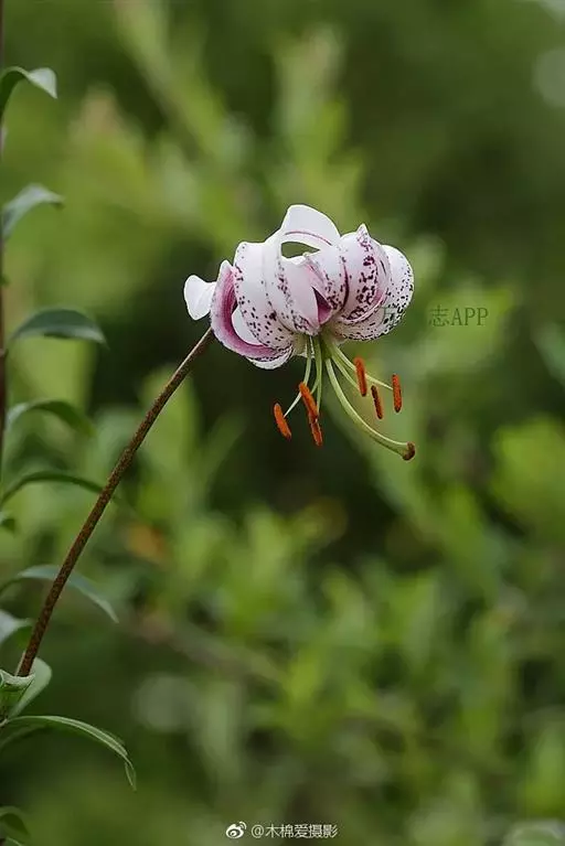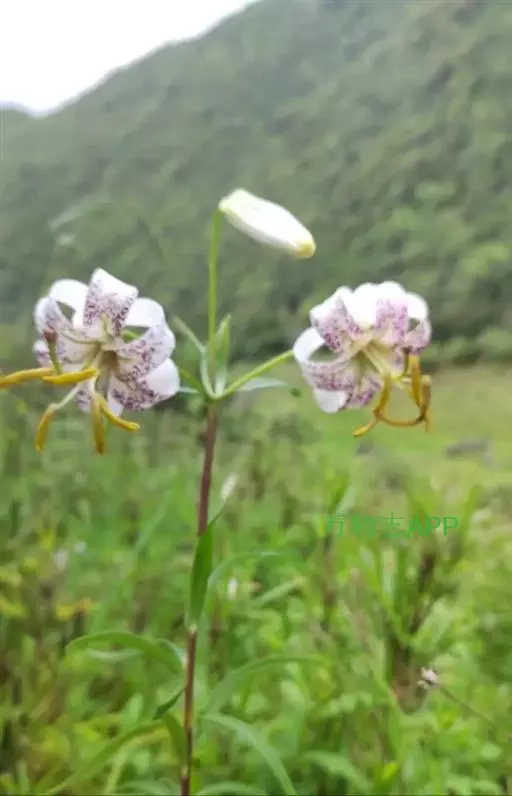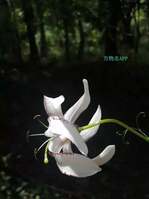 花单生或数朵排成总状花序或近伞房花序、伞形总状花序;苞片叶状,披针形,长2.5-4厘米,宽4-6毫米;花梗长10-22厘米;花下垂,有香味,白色或粉红色,有紫色斑点;花被片反卷,长4.5-6厘米,宽1.2-1.4厘米,蜜腺两边有乳头状突起;花丝长3.5厘米,无毛,花药窄矩圆形,长约1厘米,黄色;子房圆柱形,长1.2厘米,宽1.5-3毫米;花柱长为子房的2倍或更长,柱头膨大。
