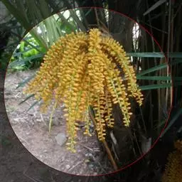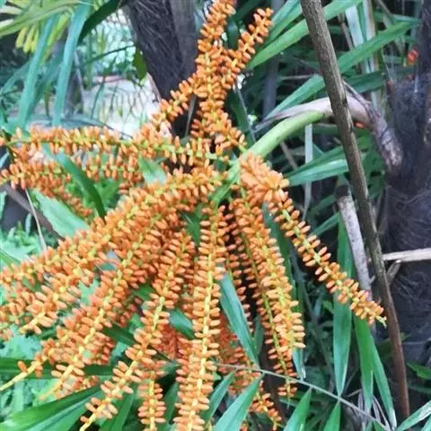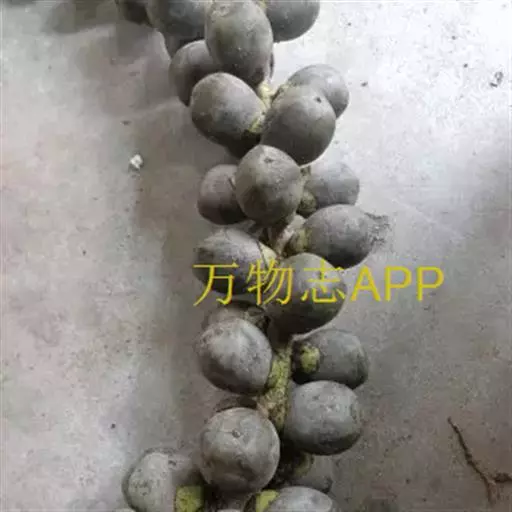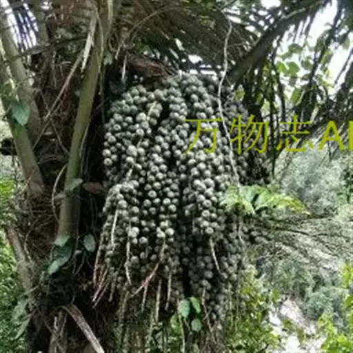 花序腋生,从上部往下部抽生几个花序,当最下部的花序的果实成熟时,植株即死亡;花序长90-150厘米,花序梗粗壮,下弯,分枝多,长达1.5米,佛焰苞多个,螺旋状排列于花序梗上;雄花大,长1.5-2厘米,花萼、花瓣各3片,雄蕊多达100枚以上;雌花花萼及花瓣各3片,花后膨大。果实近球形,直径4-5厘米,具三棱,顶端凹陷,灰褐色(未熟果实干后呈黑色)。种子3颗,黑色,卵状三棱形, 悬胚乳均匀,胚背生。花期6月,果实约在开花后2-3年时间成熟。