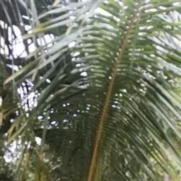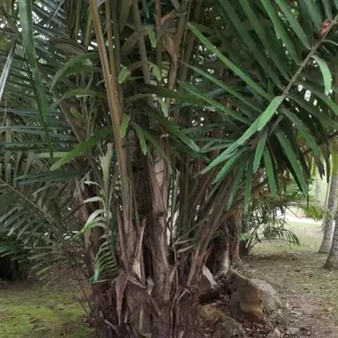 桄榔 乔木状,茎较粗壮,高5米至10余米,直径15-30厘米,有疏离的环状叶痕。叶簇生于茎顶,长5-6米或更长,羽状全裂,羽片呈2列排列,线形或线状披针形,长80-150厘米,宽2.5-6.5厘米或更宽,基部两侧常有不均等的耳垂,顶端呈不整齐的啮蚀状齿或2裂,上面绿色,背面苍白色;叶鞘具黑色强壮的网状纤维和针刺状纤维。