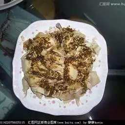 4、泡菜切粗丝,和豆腐丝,还有焯好,炒好的菜,一起铺在米饭上,生蛋一枚,放在菜中央,撒上一些芝麻碎。