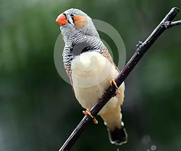 橙颊梅花雀体长约10厘米,头部灰色,两侧有大块橙色区域,嘴基及眼下方有黑纹,两条黑纹间呈白色,…
