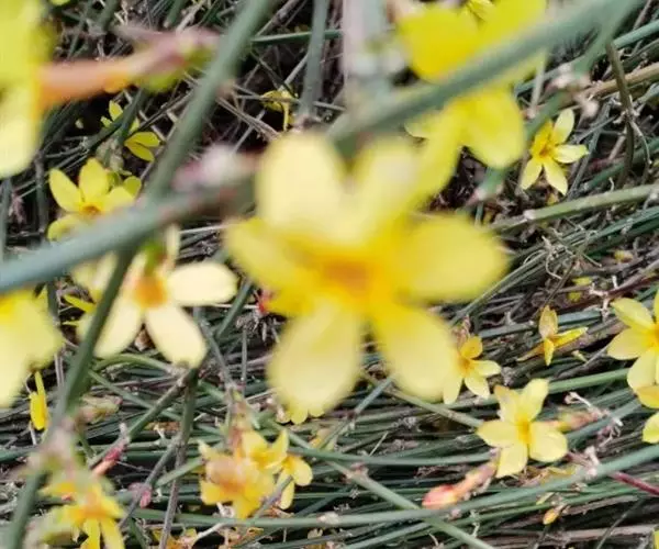 迎春花属落叶灌木植物,直立或匍匐,高0.3-5米,枝条下垂。枝稍扭曲,光滑无毛,小枝四棱形,棱上多少具狭翼。