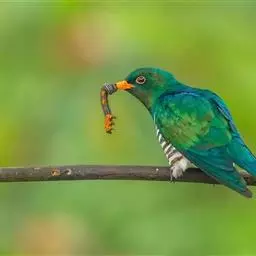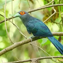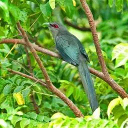 绿嘴地鹃:体形似小鸦鹃,但羽色大致绿灰;嘴绿色,头侧眼的周围有一裸区;后爪弯曲。虹膜赤红色,…