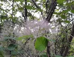 • 粉背黄栌叶卵圆形,较大,长3.5-10厘米,宽2.5-7.5厘米,无毛,但叶背显著被白粉;叶柄较长,…