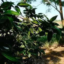芒果 常绿大乔木,高10-20米;树皮灰褐色,小枝褐色,无毛。叶薄革质,常集生枝顶,叶形和大小变化较大,通常为长圆形或长圆状披针形,长12-30厘米,宽3.5-6.5厘米,先端渐尖、长渐尖或急尖,基部楔形或近圆形,边缘皱波状,无毛,叶面略具光泽,侧脉20-25对,斜升,两面突起,网脉不显,叶柄长2-6厘米,上面具槽,基部膨大。