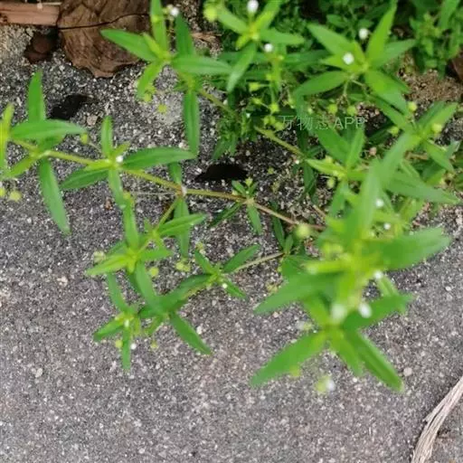 多年生草本,高30-100cm。茎近直立或平卧,小枝密被短粗毛,幼时近四棱柱形,老时圆柱形,节上常生根。叶对生;叶柄长2.7mm,托叶膜质,被毛,合生成一短鞘,先端5-7裂成刚毛状;叶片近革质,披针形或椭圆形,长3-8cm,宽1-2.5cm,先端急尖或渐尖,基部楔形或微下延,上面平滑或粗糙,下面常被粉末状短毛,侧脉4-6对。聚伞花序密集成头状,腋生;无总花梗;苞片披针形,微小;花4数,近无梗;萼筒长1mm,被毛,裂片披针形,长1-1.2mm;花冠白色,长2.5-3mm,裂片长1.5-1.8mm,广展;雄蕊生于花冠筒喉部,花药伸出;柱头2裂。蒴果球形,直径1.2-1.5mm,熟时不裂。种子每室2-6颗,种皮有小窝孔。花期春末夏初。