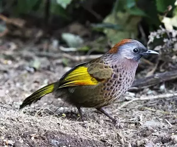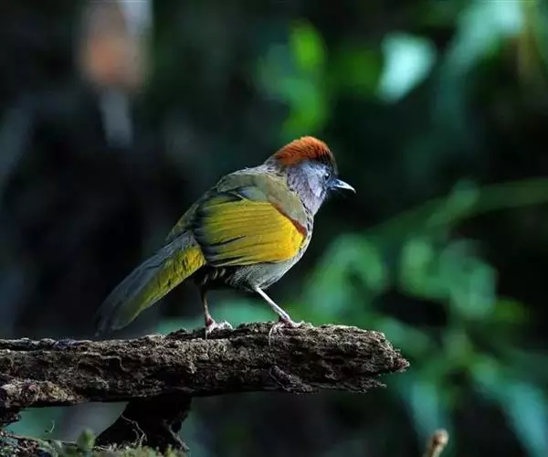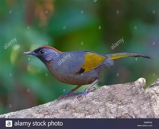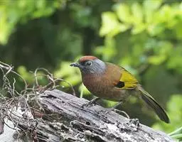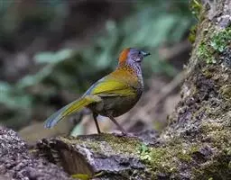 红头噪鹛(学名:Garrulax erythrocephalus)中型鸟类,体长22~28厘米。头顶棕红色,眼先、脸、颏、喉黑色,上体橄榄色或棕橄榄褐色,外侧飞羽金黄色,尾羽基部亦为金黄色,下体多为暗橄榄褐色。