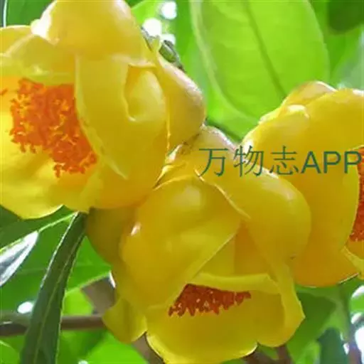 常绿灌木,高3米;嫩枝暗红色,无毛。嫩叶红褐色,老叶椭圆形或长椭圆形,先端渐尖,基部宽楔形。花为金黄色,通常单生,成腋生或顶生,花径3.5 -4.5厘米;花朵有花瓣花8-10片,宽卵形或倒卵形;子房3室,无毛;花柱顶端3裂,基部合生,无毛。花期11月次年1月,蒴果扁球形,3室,无毛。主要分布于广西武鸣县;生于海拔190-370米的石灰岩山钙质土上的常绿阔叶林中。本物种是杂交育种的良好亲本,可培育出黄色茶花新品种。