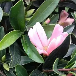 常绿灌木,高3米;嫩枝紫红色,无毛。嫩叶淡紫红色,老叶椭圆形或长椭圆形,先端急短尖,基部宽楔形或楔形。花为淡黄色,成顶生或腋生,花径 1.5-2厘米;花朵有花