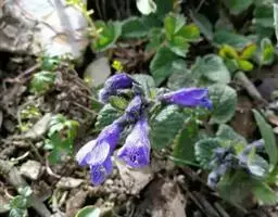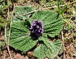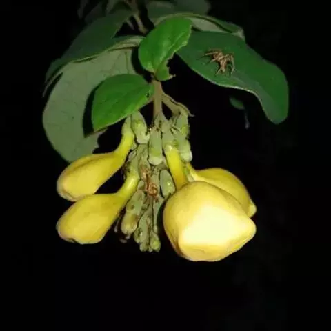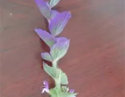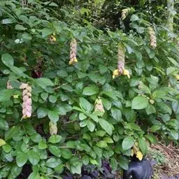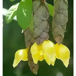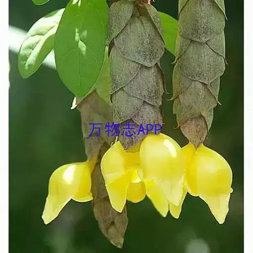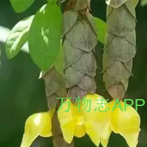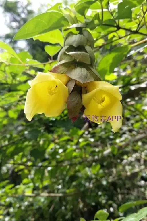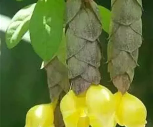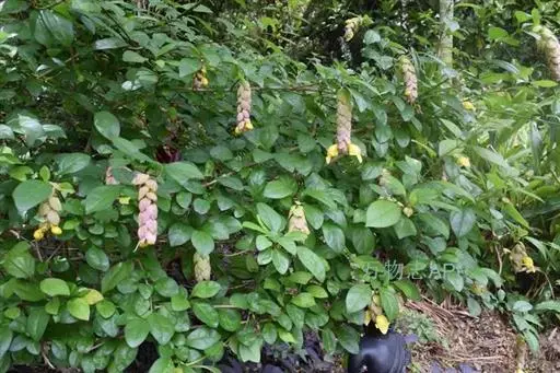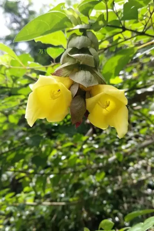 总状花序顶生,悬垂性,花冠2唇形,两侧对称,褐紫色叶状苞片;小花长5.5公分,外部被毛,上部特别阔 大,下部狭细管状,冠端4裂,有1片比较大,其它3片小形,,叶状苞片生于花的顶部,阔卵、卵或是倒卵形,苞端钝,脉纹显著,长4公分、宽3公分;绿色花萼杯形,先端截形或边缘具有4~5浅齿,外侧常会具有2~4粒大型腺体。