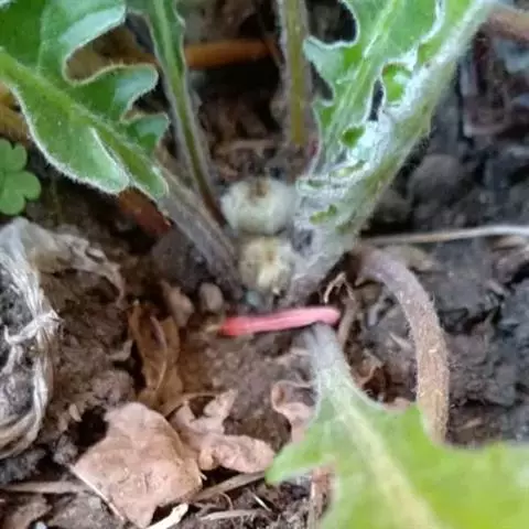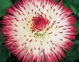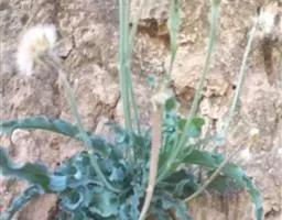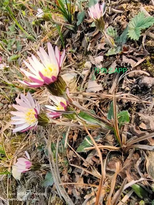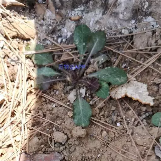头状花序单生于花葶之顶,倒锥形,直径10-15毫米;总苞略短于冠毛;总苞片约3层,外层线形,长约4毫米,内层长,线状披针形,长达8毫米,二者顶端均钝,且带紫红色,背部被绵毛;花托平,无毛,直径3-4毫米;雌花花冠舌状,长10-12毫米,舌片长圆形,长6-8毫米,顶端具不整齐的3齿或有时钝圆,带紫红色,内2裂丝状,长1.5-2毫米,花冠管纤细,长3-4毫米,无退化雄蕊。两性花花冠管状二唇形,长6-8厘米,外唇阔,长约3毫米,顶端具3齿,内唇2裂丝状,长2.5-3毫米;花药顶端圆,基部具尖的尾部;花柱分枝长约1毫米,内侧扁,顶端钝圆。瘦果纺锤形,具纵棱,被白色粗毛,长5-6毫米;冠毛粗糙,污白色,长5-7毫米。秋型者植株较高,花葶长可达30厘米,叶片大,长8-15厘米,宽4-6.5厘米,头状花序外层雌花管状二唇形,无舌片。花期春、秋二季。