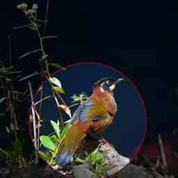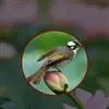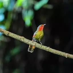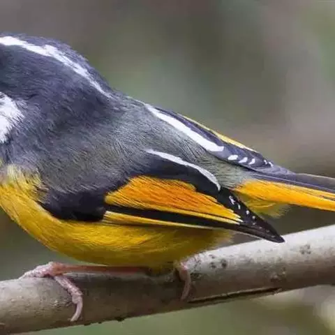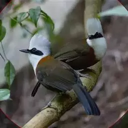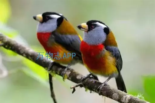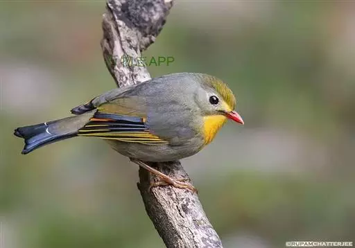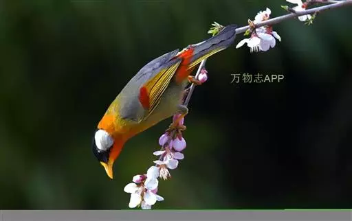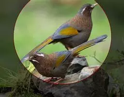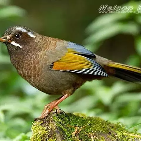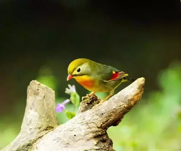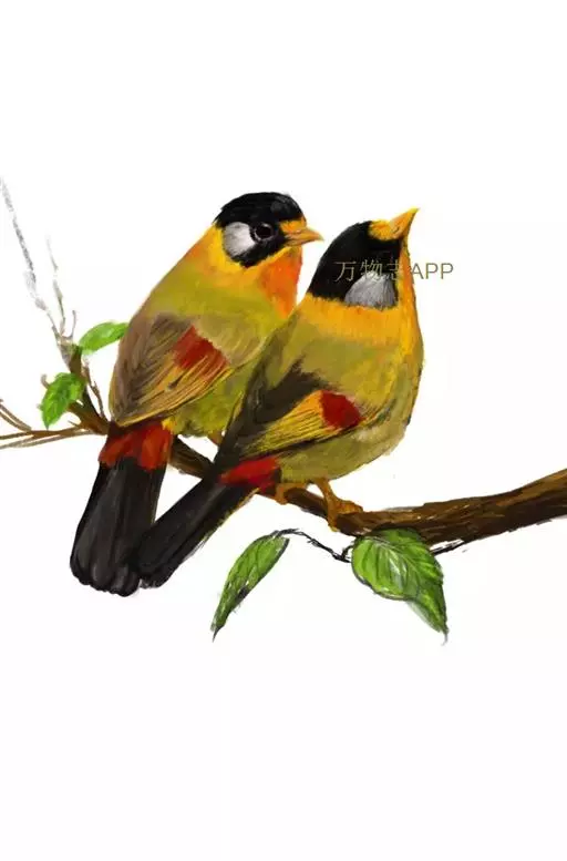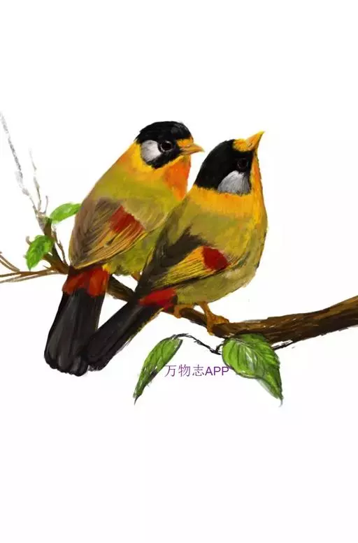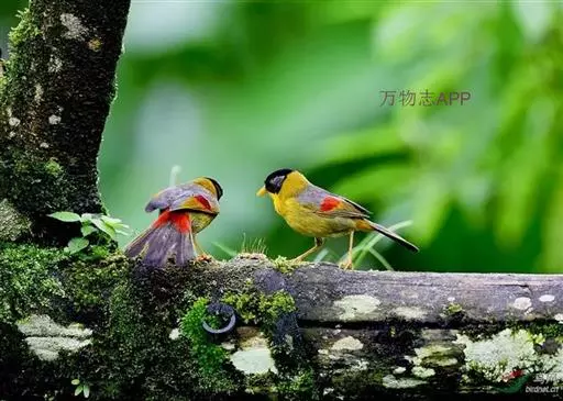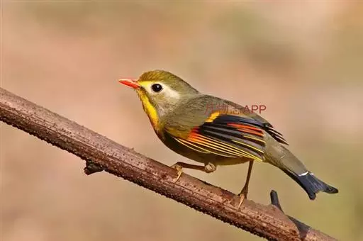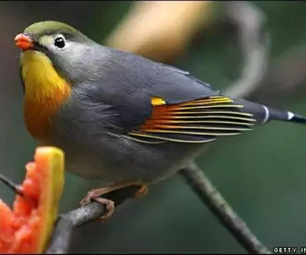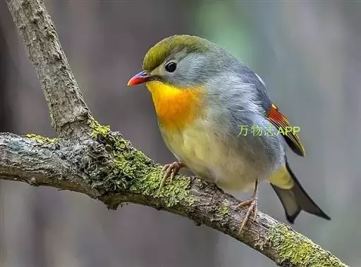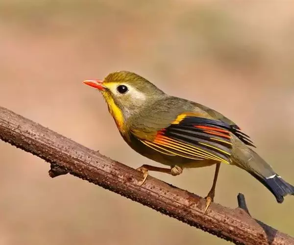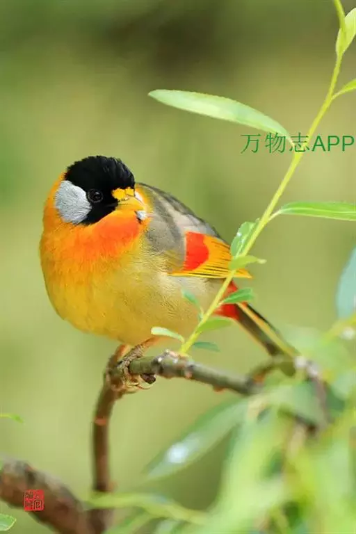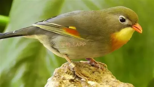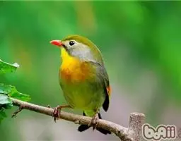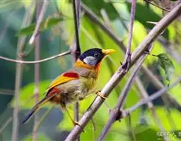银耳相思鸟(学名:Leiothrix argentauris)小型鸟类,体长14~18厘米。头顶黑色,耳羽银灰色,前额橙黄色;外侧飞羽橙黄色,基部朱红色,极为鲜艳、醒目。尾圆形,尾上、尾下覆羽朱红色,尾暗灰褐色,外侧尾羽橙黄色,其余上体橄榄绿或橄榄黄色。喉、胸朱红色或黄色,嘴橙黄色。相似种红嘴相思鸟嘴为红色,头顶绿褐色,耳羽浅灰色,尾呈叉状,黑色。区别明显,野外不难识别。