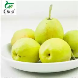 沙果梨:果实很小,重22-43克(纵径3-4.5厘米,横径3.5-4.7厘米),多为扁圆形;果皮黄色,细而薄,基部被有淡红色晕;果点棕色;果梗短,长1.5-2厘米;梗洼甚浅小,有小形沟纹2-3条;萼片宿存;萼洼浅广;果肉白色,后熟后肉质柔软,汁多,昧酸甜微涩,有浓香,石细胞较多。