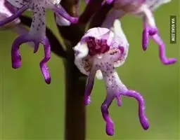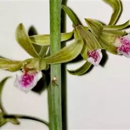 花序通常长2-8厘米,总状或基部有1-2个分枝而成圆锥状,具2-10朵花,但每次仅开1朵花;花苞片宽卵状三角形,基部围抱花序轴,长3-5毫米;花梗和子房长1.5-3厘米;花粉红色或略带紫色或白色;萼片狭椭圆形或狭椭圆状披针形,长2.5-4厘米,宽7-9毫米;花瓣椭圆形或卵状椭圆形,与萼片近等长,宽1.3-1.5厘米;唇瓣轮廓近长圆状卵形,长2.5-4厘米,3裂;侧裂片钝,内弯,围抱蕊柱;中裂片近方形,长1-1. 4厘米,先端2浅裂或微凹;唇盘上有3(-5)条褶片;蕊柱稍向前弯,长2-2.5厘米。蒴果近长圆形,长约3厘米,宽8-10毫米。