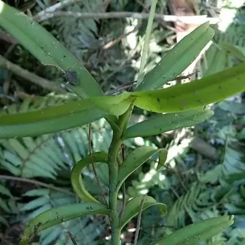 竹叶兰植株高40-80厘米,有时可达1米以上;地下根状茎常在连接茎基部处呈卵球形膨大,貌似假鳞茎,直径1-2厘米,具较多的纤维根。茎直立,常数个丛生或成片生长,圆柱形,细竹秆状,通常为叶鞘所包,具多枚叶。叶线状披针形,薄革质或坚纸质,通常长8-20厘米,宽3-15 (-20)毫米,先端渐尖,基部具圆筒状的鞘;鞘抱茎,长2-4厘米。