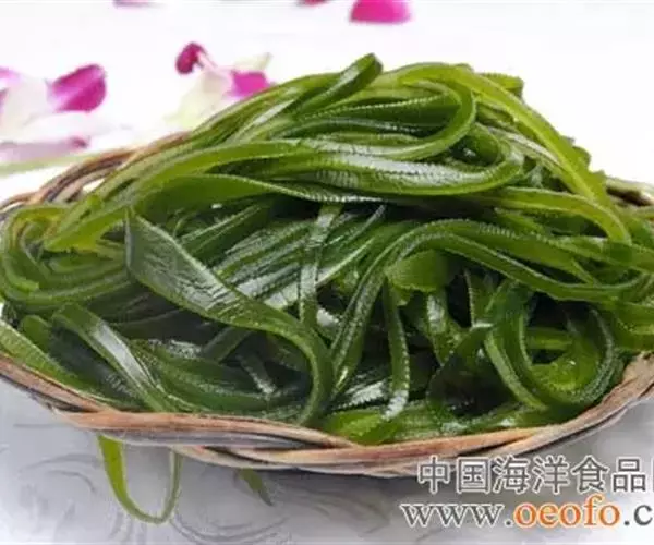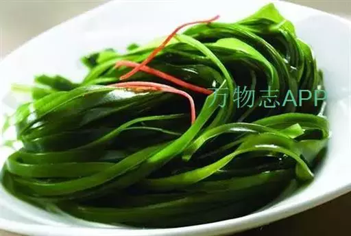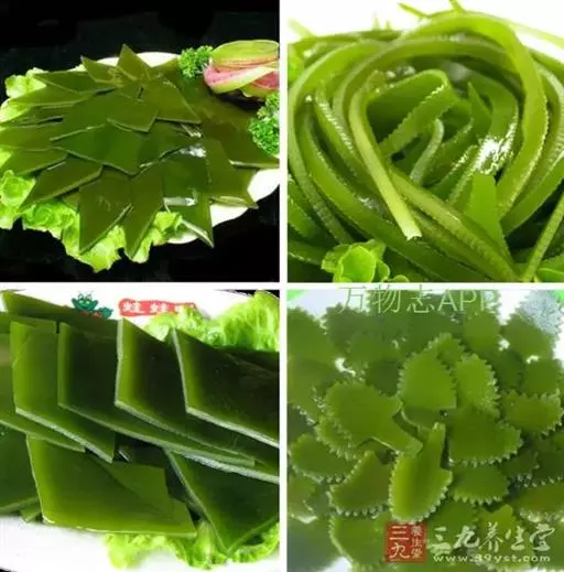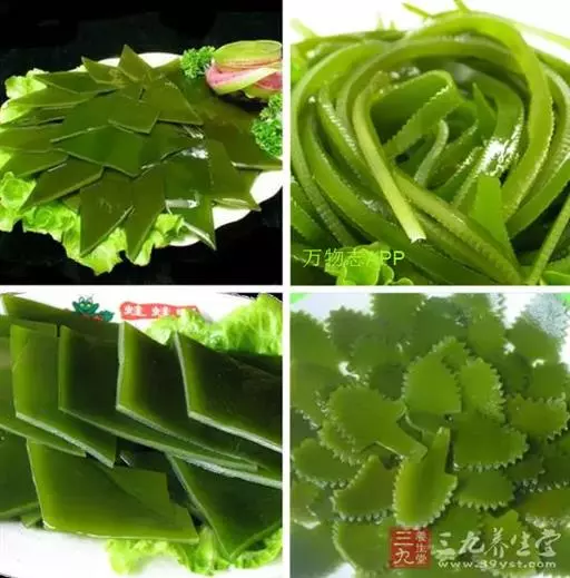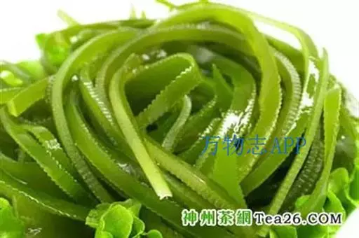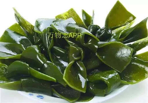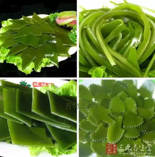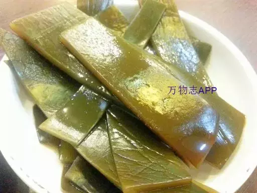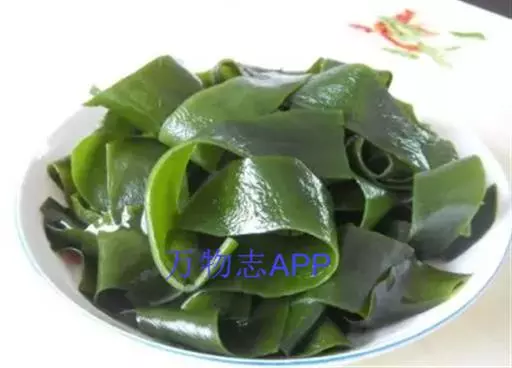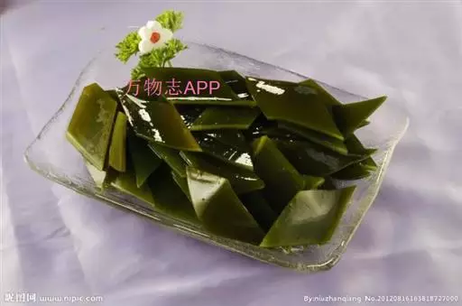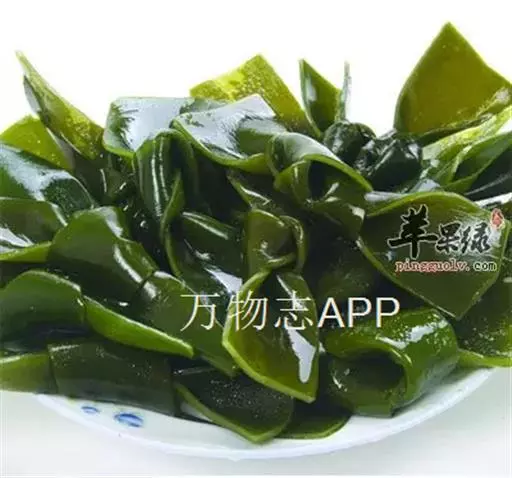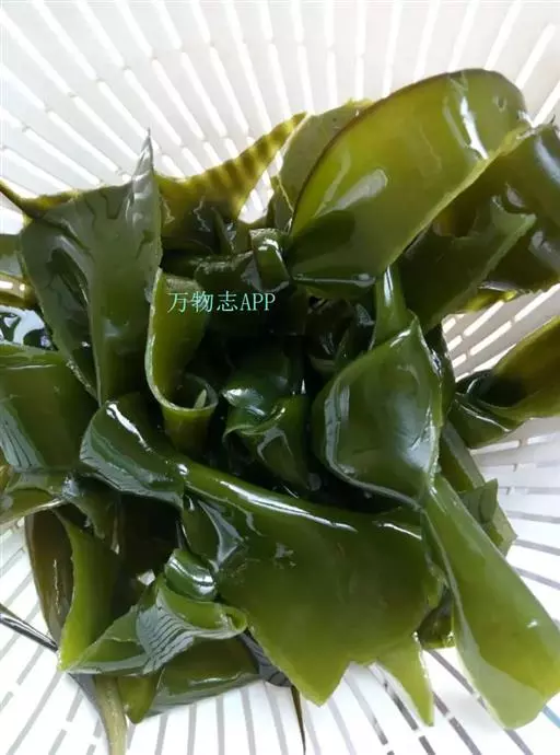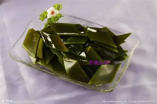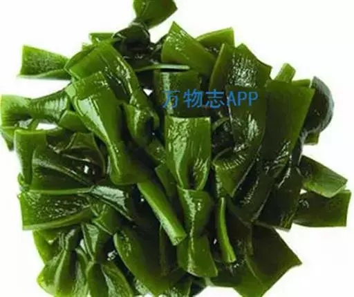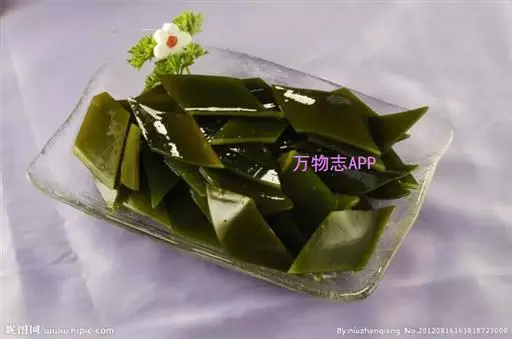 【成分】鲜品可食用部分100%。每100g中含能量70kJ、水分94.4g,蛋白质1.2g,脂肪0.1g,膳食纤维0.5g,碳水化合物1.6g,硫胺素0.02mg、核黄素0.15mg,尼克酸1.3mg:维生素E 1.85mg;钾246mg,钠8.6mg,钙46mg,碘0.28mg,镁25mg、铁0.9mg,锰0. 07mg、锌0.16mg,磷22mg、硒9.54μg。维生素C未检出。尚含藻胶酸(高达32%)和昆布素等。