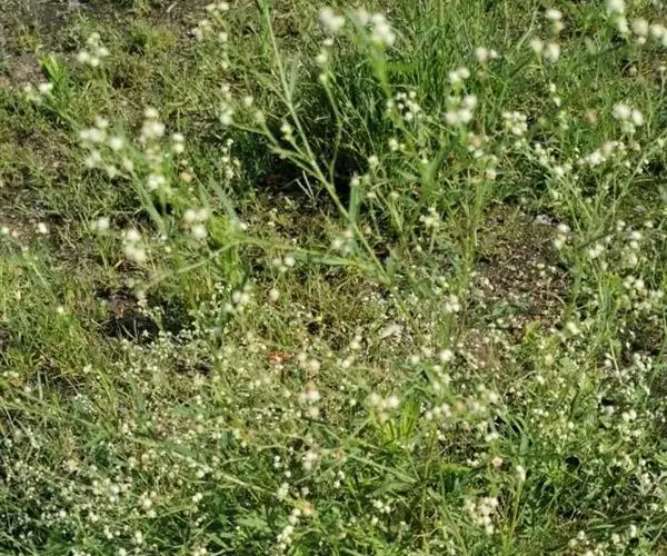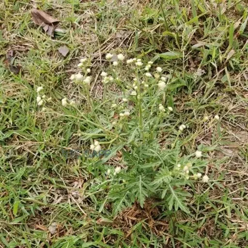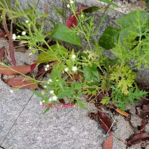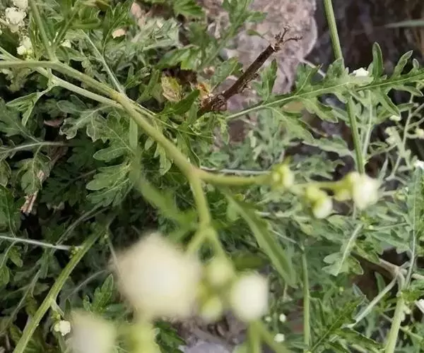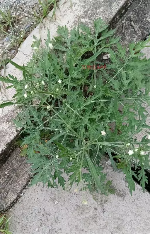 银胶菊(学名:Parthenium hysterophorus L.):一年生草本。茎直立,高0.6-1米,多分枝,具条纹,被短柔毛,节间长2.5-5厘米。下部和中部叶二回羽状深裂,全形卵形或椭圆形,小羽片卵状或长圆状,常具齿;上部叶无柄,羽裂,裂片线状长圆形,全缘或具齿,中裂片较大,通常长于侧裂片的3倍。头状花序多数,径3-4毫米,在茎枝顶端排成开展的伞房花序。舌状花1层,5个,白色,长约1.3毫米,舌片卵形或卵圆形,顶端2裂。管状花多数。雌花瘦果倒卵形,基部渐尖,干时黑色,顶端截平或有时具细齿。花期4-10月。