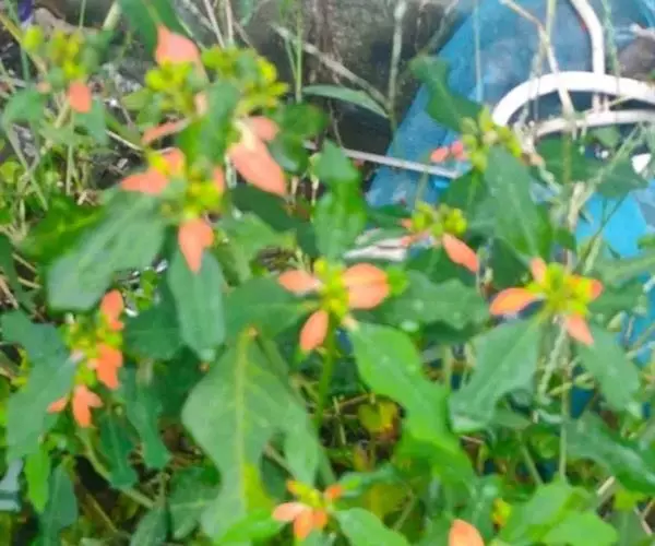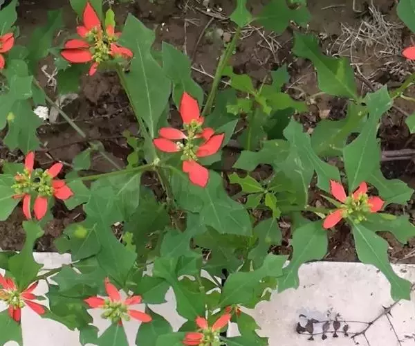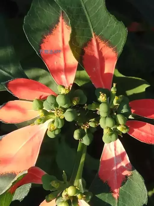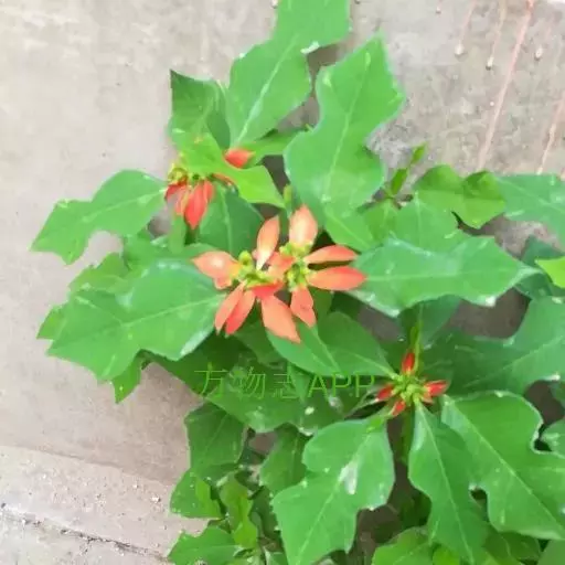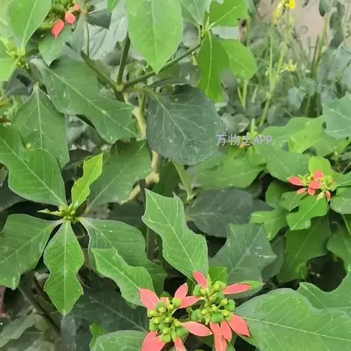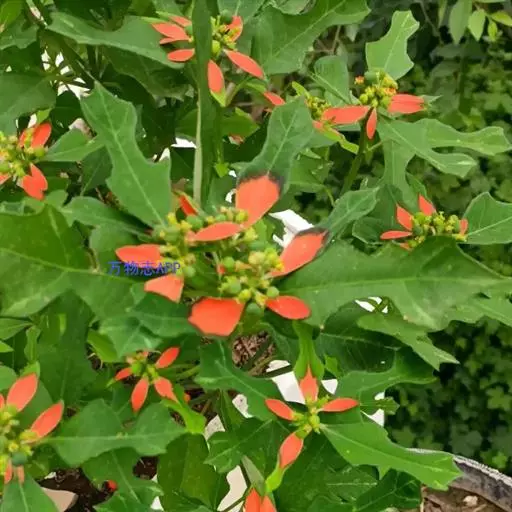 猩猩草(学名:Euphorbia cyathophora Murr.):常绿或半常绿灌木,盆栽时株高0.5米-2米,在亚热带地区可长到6米以上。茎直立而光滑,单叶互生,卵状椭圆形至阔披针形,具不规则的深缺刻。长10-15厘米。花小,有蜜腺,排列成密集的伞房花序。总苞形似叶片,也叫顶叶,基部大红色,也有半边红色半边绿色的。上面簇生出红色的苞片,向四周放射而出,苞片和叶片相似,只是较狭,是主要观赏部位。雌雄同株异花,雌花单生于花序的中央,雄花多数,均无花被。蒴果扁圆形。种子卵圆形,黑色。