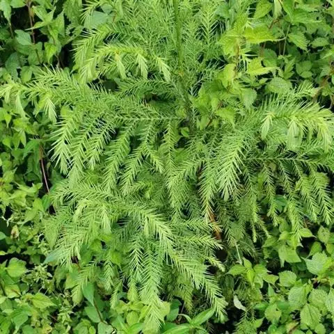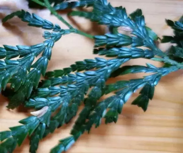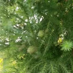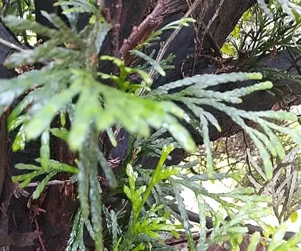 福建柏 乔木,高达17米;树皮紫褐色,平滑;生鳞叶的小枝扁平,排成一平面,二、三年生枝褐色,光滑,圆柱形。鳞叶2对交叉对生,成节状,生于幼树或萌芽枝上的中央之叶呈楔状倒披针形,通常长4-7毫米,宽1-1.2毫米,上面之叶蓝绿色,下面之叶中脉隆起,两侧具凹陷的白色气孔带,侧面之叶对折,近长椭圆形,多少斜展,较中央之叶为长,通常长5-10毫米,宽2-3毫米,背有棱脊,先端渐尖或微急尖,通常直而斜展,稀微向内曲,背侧面具1凹陷的白色气孔带;生于成龄树上之叶较小,两侧之叶长2-7毫米,先端稍内曲,急尖或微钝,常较中央的叶稍长或近于等长。雄球花近球形,长约4毫米。