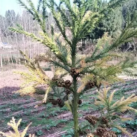 球果近球形,熟时褐色,径2-2.5厘米;种鳞顶部多角形,表面皱缩稍凹陷,中间有一小尖头突起;种子顶端尖,具3-4棱,长约4毫米,上部有两个大小不等的翅,大翅近卵形,长约5毫米,小翅窄小,长约1.5毫米。花期3-4月,种子翌年10-11月成熟。