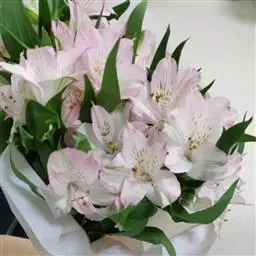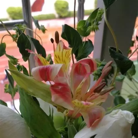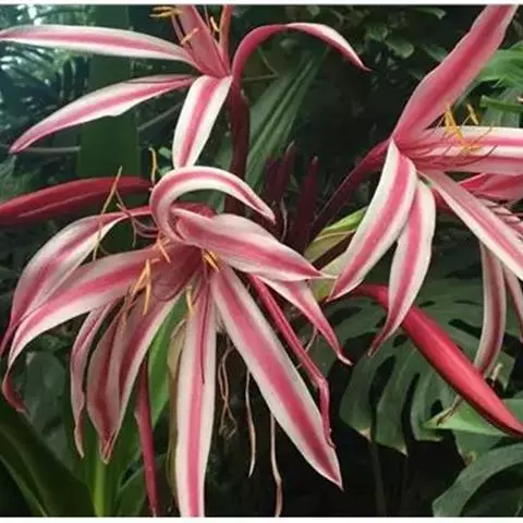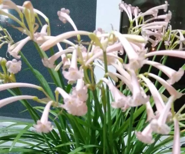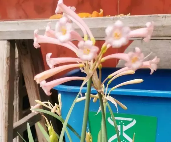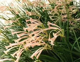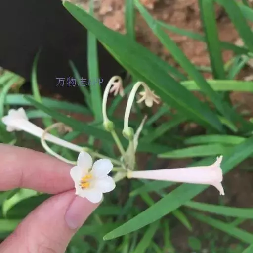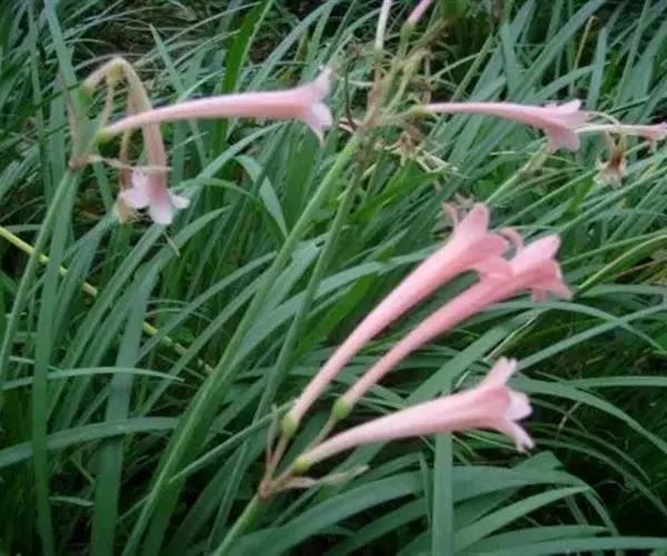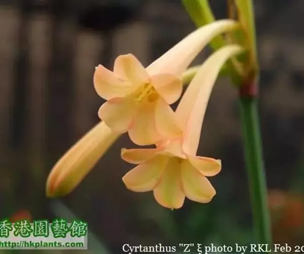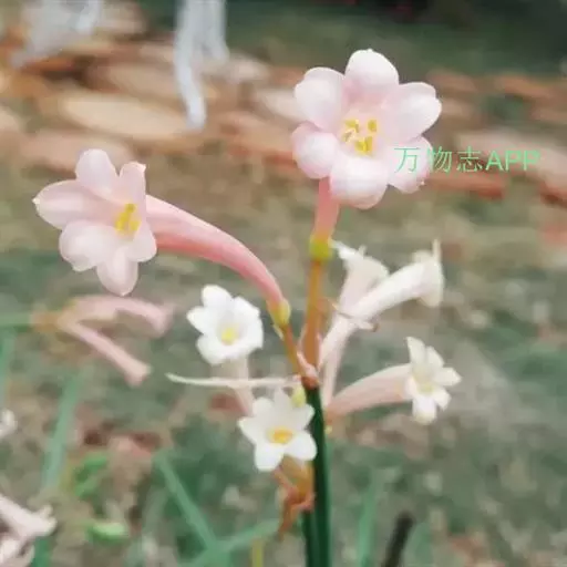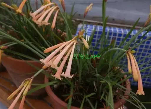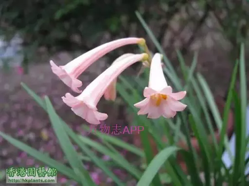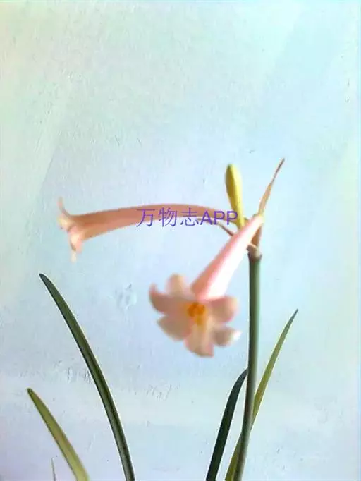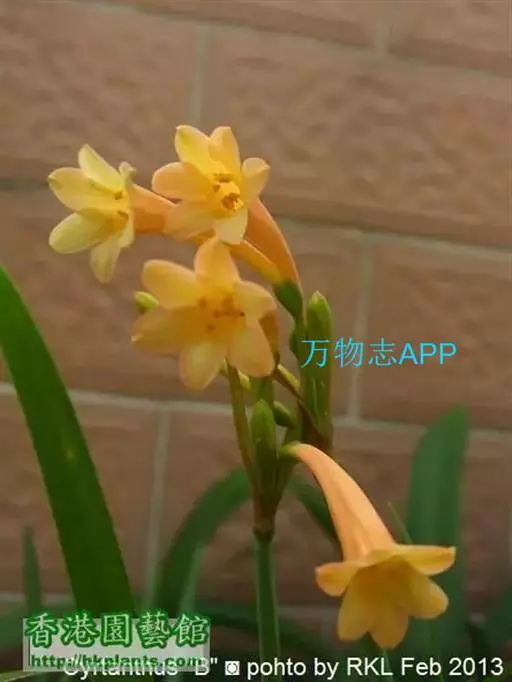 多年生常绿球根植物,株高约20~30cm,地下鳞茎球形。叶线形,绿色。花自地下鳞茎抽生而出,细长,花呈长筒状,略低垂,每个花枝着花8朵左右,有黄、橙红、白、粉红等色。