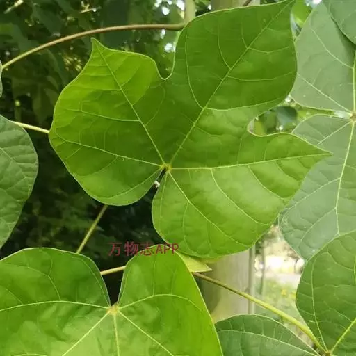 梧桐树是落叶乔木,高达15米;树叶青绿色,平滑。叶呈心形,掌状3~5裂,直径15~30厘米,裂片是三角 梧桐树(图2) 形,顶端渐尖,基部心形,两面均无毛或略披短柔毛,基生脉7条,叶柄与叶片等长。圆锥花序顶生,长约20~50厘米,下部分枝长达14厘米,花淡紫色;萼5深裂几至基部,萼片条形,向外卷曲,长7~9毫米,外面披淡黄色短柔毛,内面仅在基部披柔毛;花梗与花几等长;雄花的雌雄蕊柄与萼等长,下半部较粗,无毛,花药15个不规则地聚集在雌雄蕊柄顶端,退化子房梨形且甚小;雌花的子房圆球形,被毛覆盖。蓇葖果膜质,有柄,成熟前开裂成叶状,长6~11厘米、宽1.5~2.5厘米,外面短茸毛或几无毛,每蓇葖果有种子2~4个;种子圆球形,表面有皱纹,直径约6~7毫米。花期6月左右。