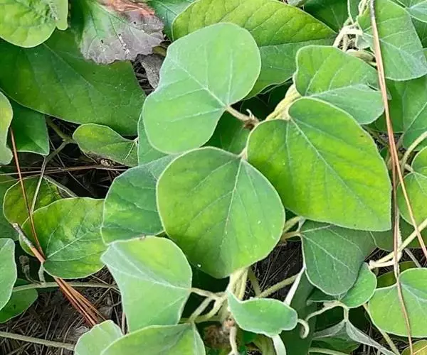 木质藤本;根细长,圆柱形;嫩枝密被灰白色长绵毛,老枝无毛,干后常有纵槽纹,暗褐色。叶纸质,卵形、卵状心形,长3.5-10厘米,宽2.5-8厘米,顶端钝圆至短尖,基部心形,基部两侧裂片广展,湾缺深1-2厘米,边全缘,上面被糙伏毛,下面密被灰色或白色长绵毛,基出脉5-7条,侧脉每边3-4条;叶柄长2-5厘米,密被白色长绵毛。