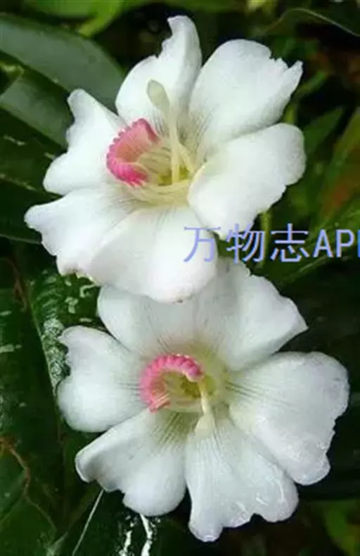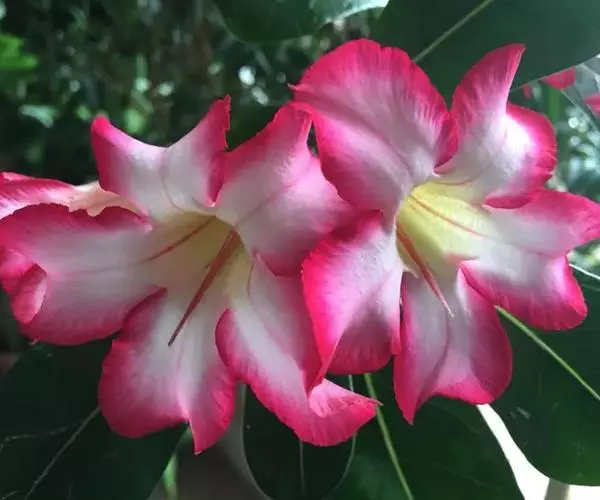 沙漠玫瑰花形似小喇叭,玫瑰红色,非常艳丽。伞形花序三五成丛,灿烂似锦,四季开花不断。因原产地接近沙漠且红如玫瑰而得名沙漠玫瑰。沙漠玫瑰单叶互生,倒卵形,顶端急尖,长8厘米~10厘米,宽2厘米~4厘米,革质,有光泽,腹面深绿色,背面灰绿色,全缘。总状花序,顶生,着花10多朵,喇叭状,长6厘米~8厘米;花冠5裂,有玫红、粉红、白色及复色等。5月~12月是沙漠玫瑰的花期,花有红、玫红、粉红、白等色。南方温室栽培较易结实。种子有白色柔毛,可助其飞行散布。